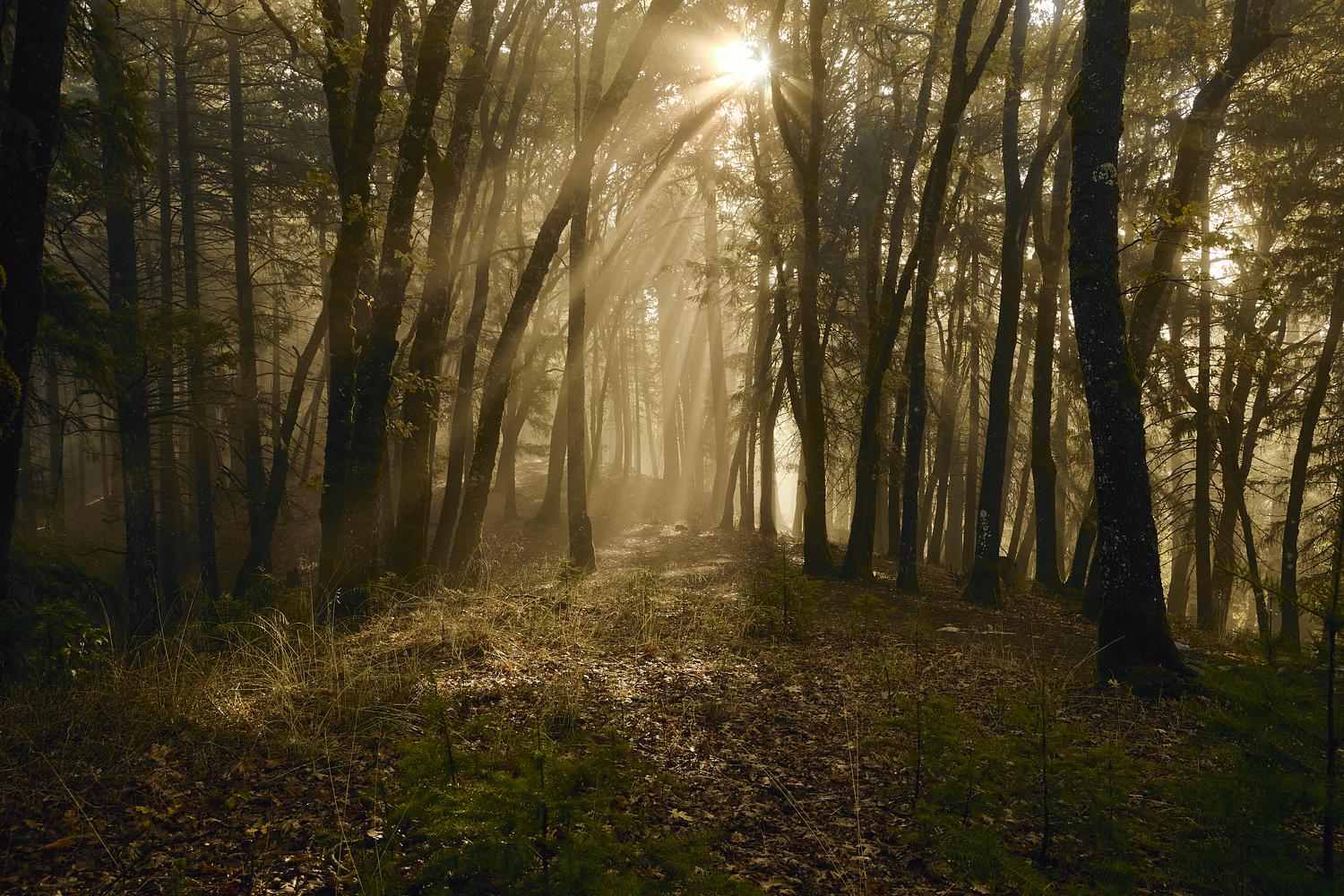 A thick fog blankets the forest of Castle Crags State Park, California. Taken just after sunrise to best accentuate the sunbeams.